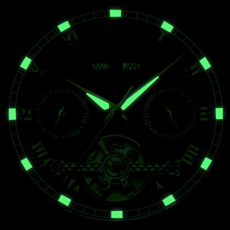 SKJELETTURVISER: Den gjennombrutte skjelettdesignen fremhever den intrikate mekanikken og gir et raffinert, luksuriøst uttrykk. Kronen er sømløst integrert med knappene for måned og dato - både funksjonelt og estetisk raffinert.