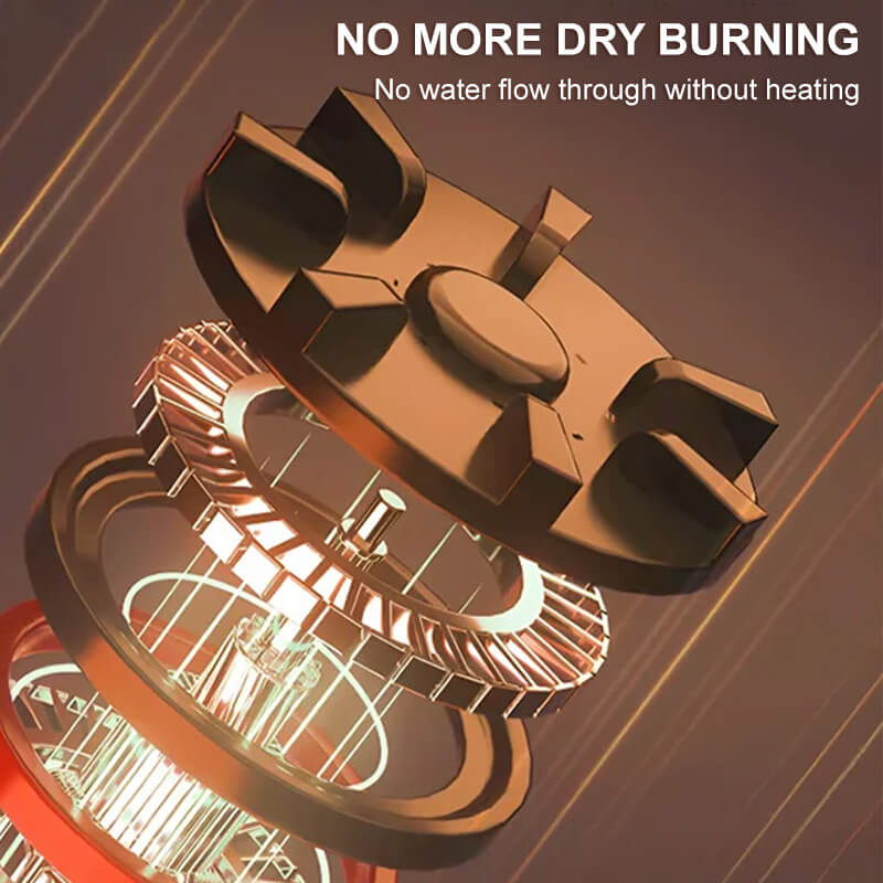 Med flere beskyttelsesanordninger gjennomgår hvert element strenge tester for å sikre 100 % sikkerhet. Innvendige vann- og strømledninger er konstruert for å kjøre separat for å unngå lekkasje eller kalkavleiringer. Sikker varmeovn, strømsparing, vannsparing, ingen forurensning, ingen eksosgasser. Temperaturen justeres av vannstrømsreguleringsventilen eller kranbryteren.